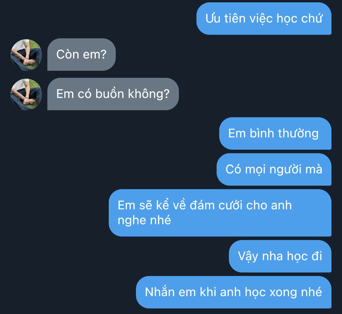 Điện thoại vẫn nằm lặng lẽ bên cạnh. Không có thêm tin nhắn nào nữa. Cậu khẽ thở ra, rồi đưa tay tắt màn hình, cười nhẹ một cái với chính mình.