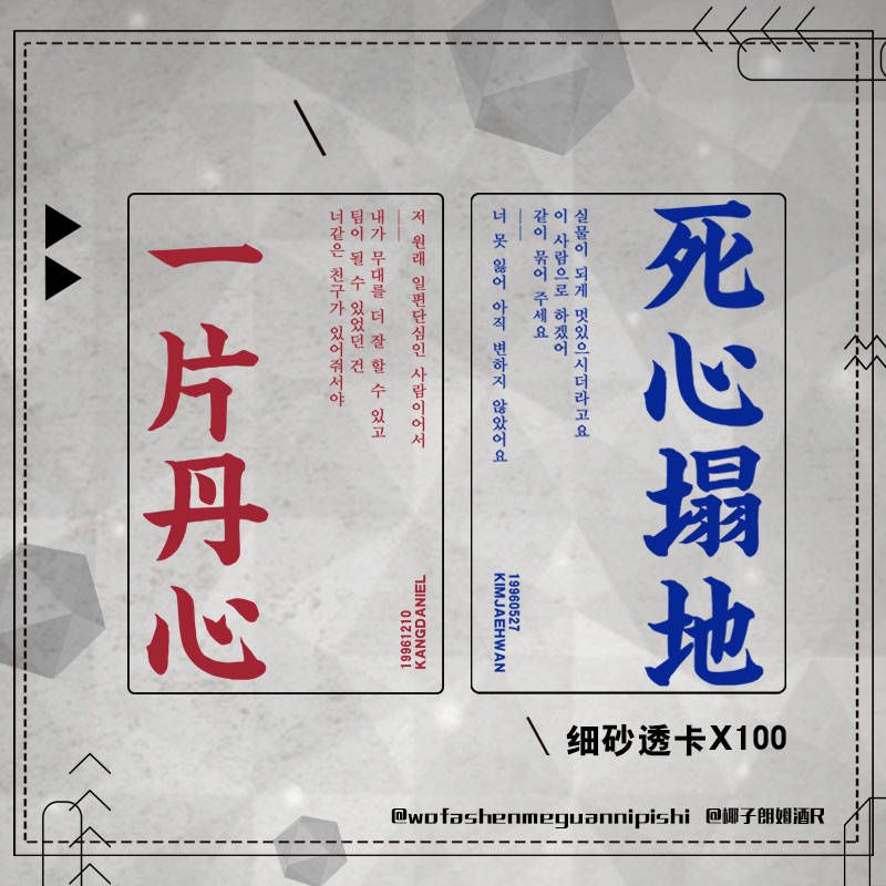 Trên card của Niel là dòng chữ "Nhất phiến đơn tâm", của Hwan là "Tử tâm tháp địa", trong phần X-con tui có giải thích nghĩa, là hai câu thành ngữ nói về sự kiên trì theo đuổi đến cùng/một lòng một dạ, cũng mang cả tên hai người.
