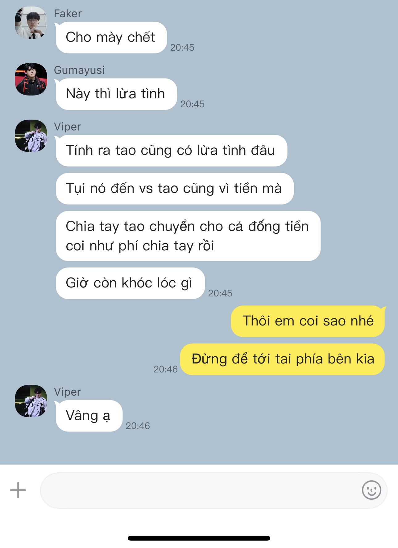 "Không phải đâu, tại mình bỏ lâu quá rồi ấy" Dohyeon lắc đầu, nhưng rồi lại thấy không thể nén cười. "Mình không giả vờ đâu, bạn đừng giần mình nữa mà."