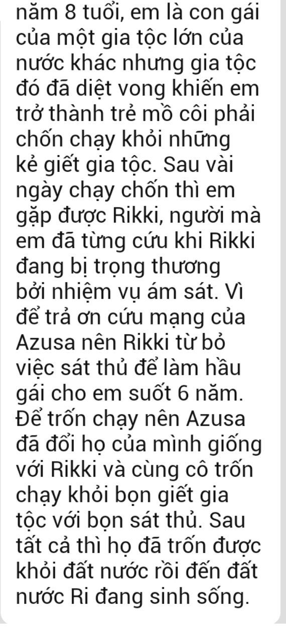 Bổ sung:Rikki và Azusa sau khi thoát khỏi đám sát thủ thì cả 2 đã kiệt sức đúng lúc đó có 1 đám Sửu nhi nào đó thấy 2 người họ và muốn hi*p 2 người,Rikki mặc dù từng là cựu sát thủ của Ám Linh nhưng cô lúc này đã không còn sức để phản kháng,tưởng như cả 2 sẽ mất đi sự trong trắng thì đúng lúc đó Rimuru xuất hiện để giải cứu và thăm hỏi sau đó Rikki đã kể lại mọi chuyện từ trước tới giờ của cô và Azusa,sau khi nghe xong thì cô và Azusa được Rimuru mời đến đất nước Tempest,Rikki và Azusa đã xin làm thuộc hạ nhưng bị Rimuru từ chối vì thế cô đã xin phép Rimuru để thành lập 1 mái nhà tình thương để chăm sóc cho những đứa trẻ sinh ra đã không có cha mẹ hoặc bị bỏ rơi,mọi thứ đều rất tốt đẹp cho đến khi...1 kẻ bí ẩn đã giết toàn bộ người dân Tempest những đứa trẻ mồ côi đều bị hắn ta giết không thương tiếc,mặc dù cô đã cố gắng hết sức để bảo vệ bọn trẻ nhưng vô dụng sức của Rikki có giới hạn,khi Rikki và Azusa đã chuẩn bị để đón chờ cái chết thì có 1 hố đen xuất hiện và kéo cả 2 đi sau đó Rikki và Azusa dần mất đi ý thức và ngất đi.