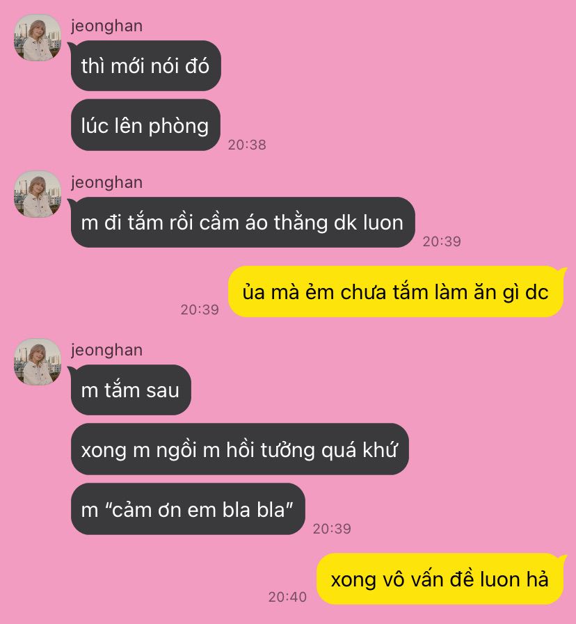 dk tắm xong thì đi ra bảo Jisoo vào tắm lẹ đi kẻo bệnh, cậu xả sẵn nước ấm cho anh rồi