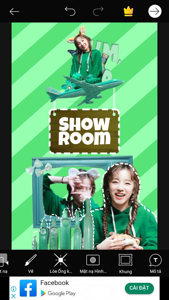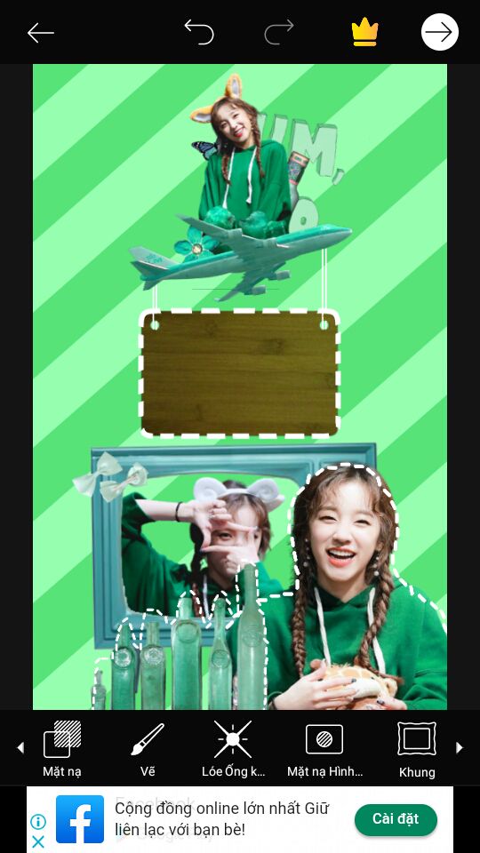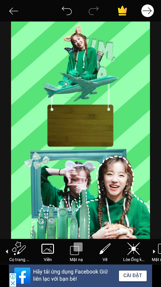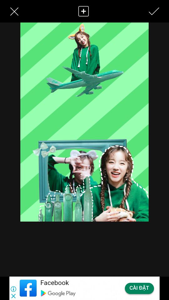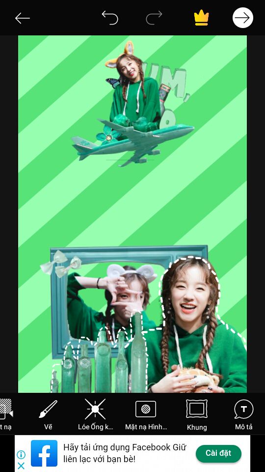 Bước 5 : Thế là xong phần dưới. Bây giờ mình sẽ lo phần trên. Add render + png. Png máy bay mình không xài trong pack png, mình xài trong nhãn dán của Picsart [ keyword : plane ] rồi dùng sắc độ để chỉnh màu. Canh model và plane xích lên trên để có chỗ chèn text.