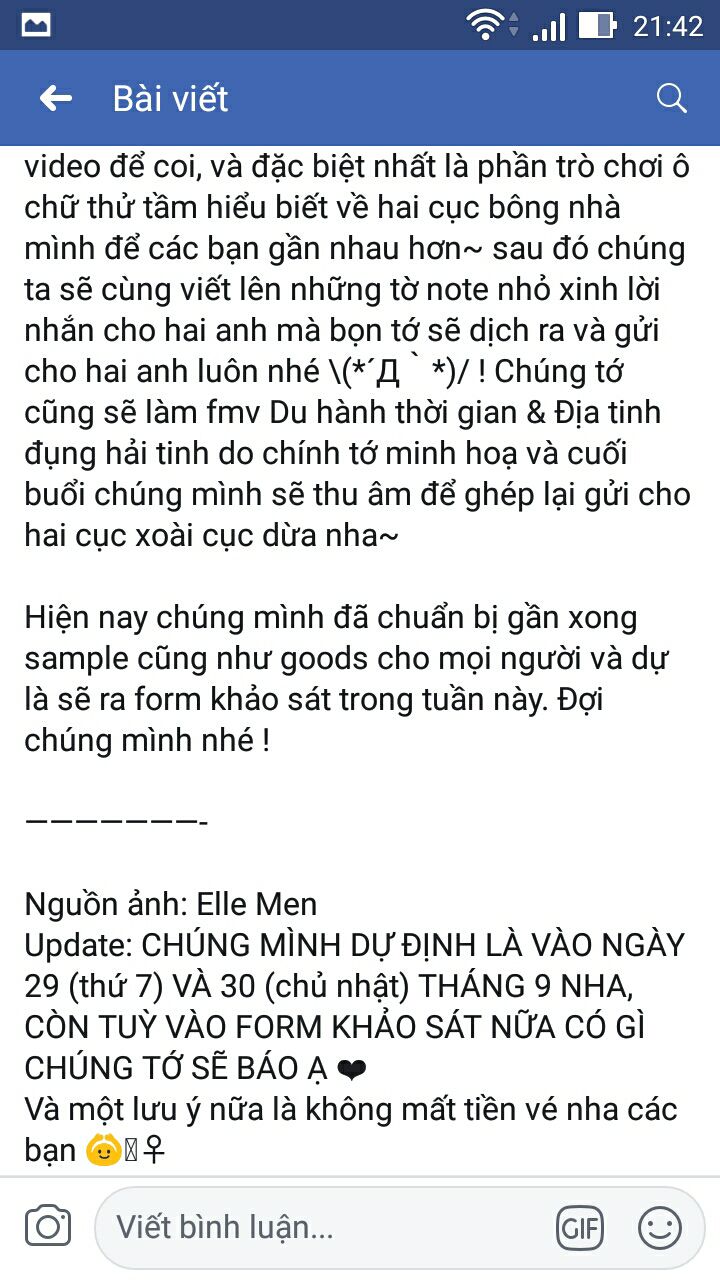 Ta không biết có đi được không vì có thể bố ta sẽ không cho đi QAQ. Cái chỗ đó cũng có vẻ xa. Hiện tại cũng chưa biết off vào thứ 7 hay chủ nhật nữa. Ta mong là chủ nhật vì nếu không và ngày đấy thì có lẽ phải đợi năm sau cơ, mà ta lại rất ghét chờ đợi QAQ.