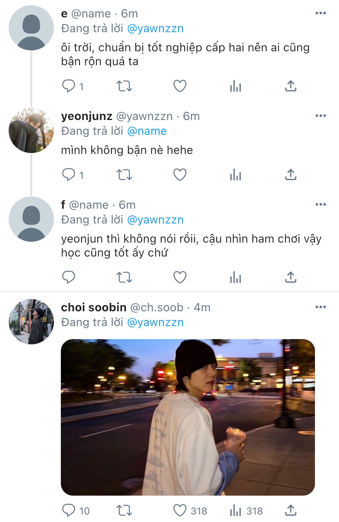 quay lại nhìn thấy cậu bạn ngốc nghếch, soobin có chút buồn cười, nhưng rồi cũng chẳng đáp lại, chỉ đưa tay lên vẫy khẽ, như thể sẽ là một lời hứa không rõ bản thân có thực hiện hay không.