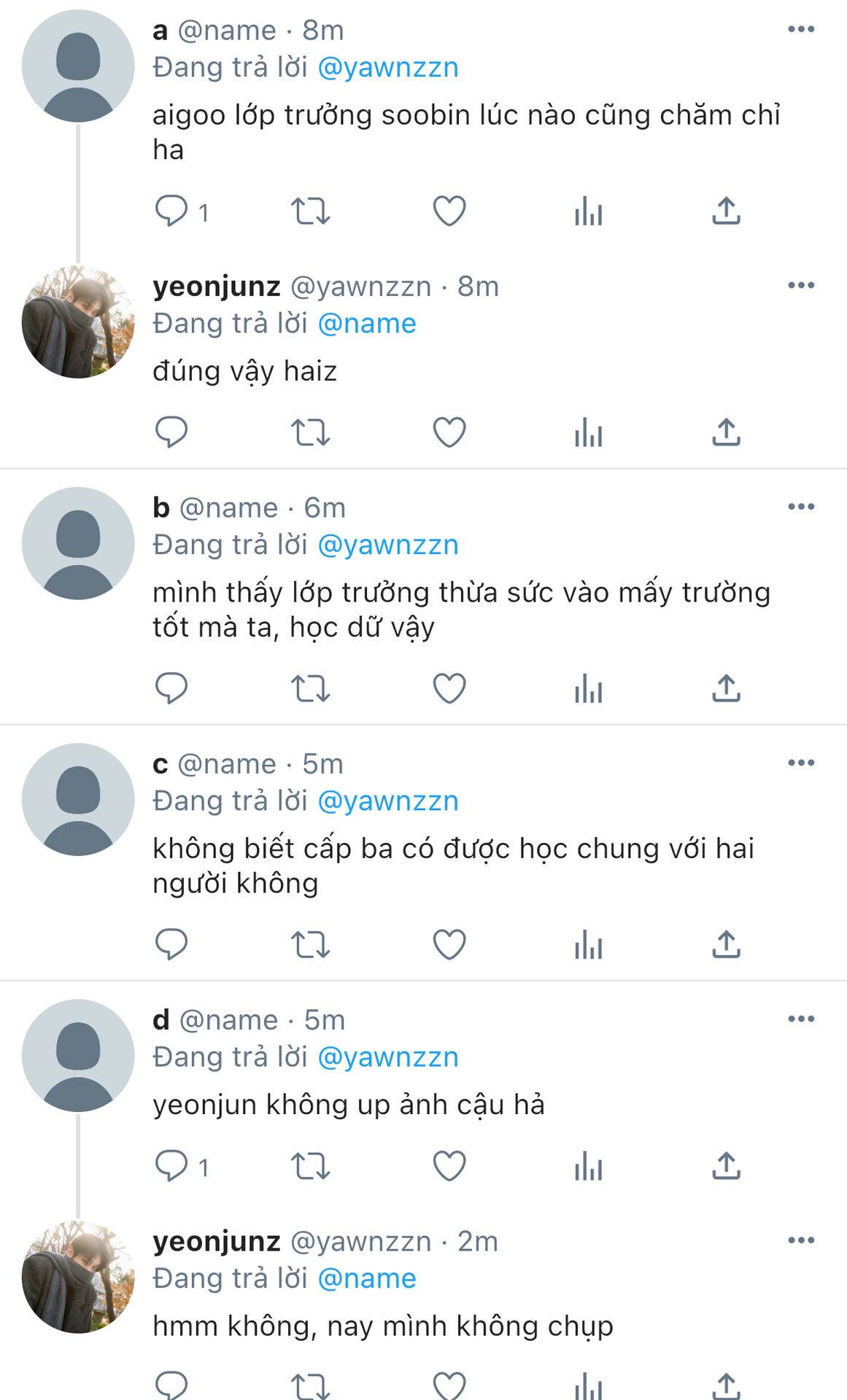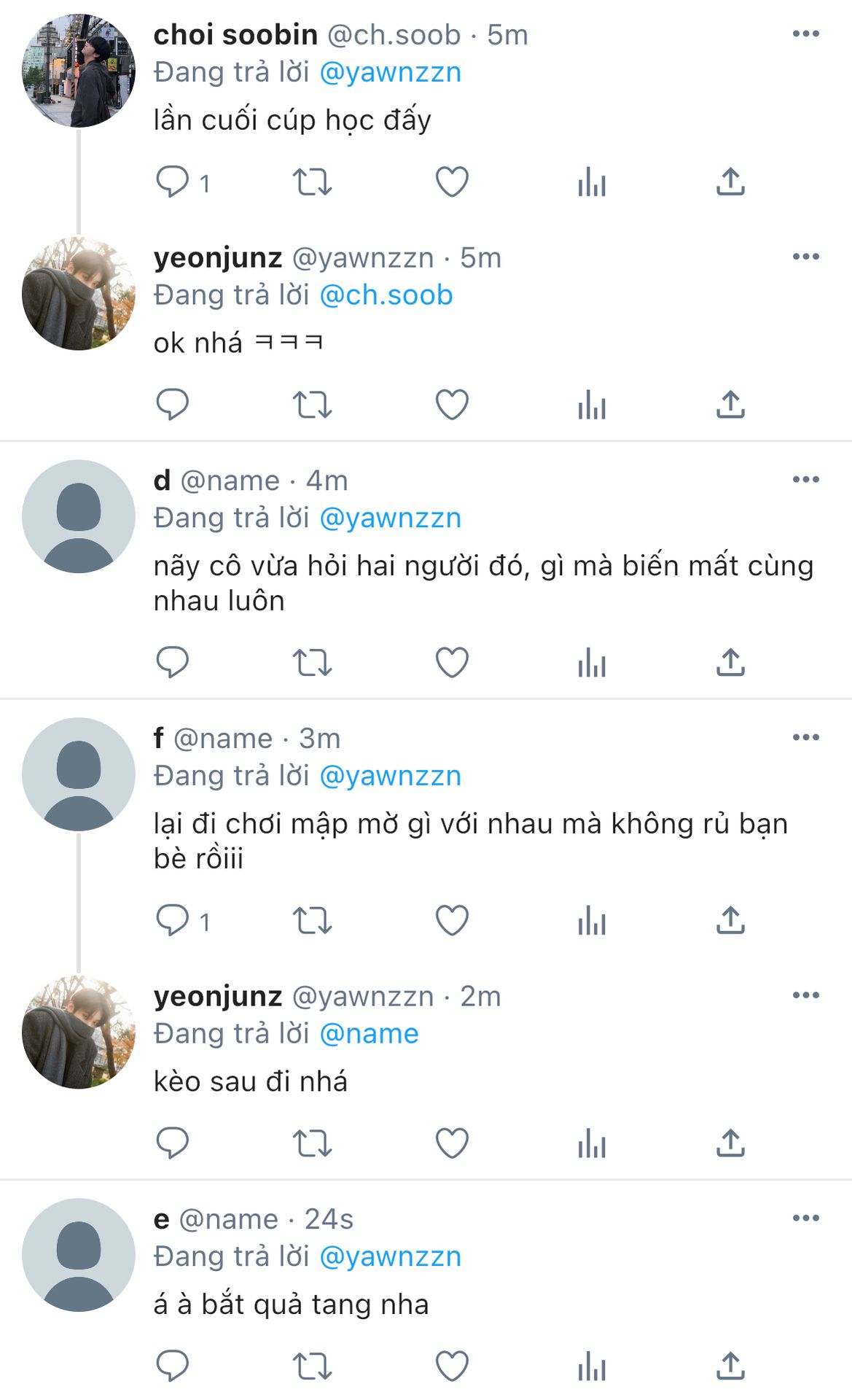 "tự nhiên nghiêm túc quá ha, ít nhất vẫn còn gặp nhau trên lớp mà."