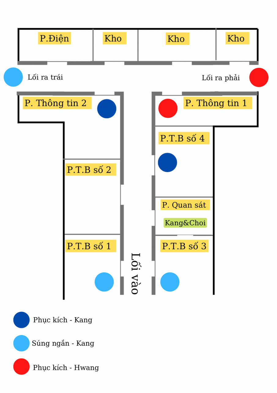 "Ừm, nếu hai đội phục kích ở hai phòng thông tin tấn công cùng lúc thì có thể tạo thành thế gọng kìm. Vì phía dưới có thêm một đội phục kích rồi nên thế này sẽ rất khó phá. Trường hợp nếu lão phá được vòng vây thì cả ba lối ra đều đã bị chặn"