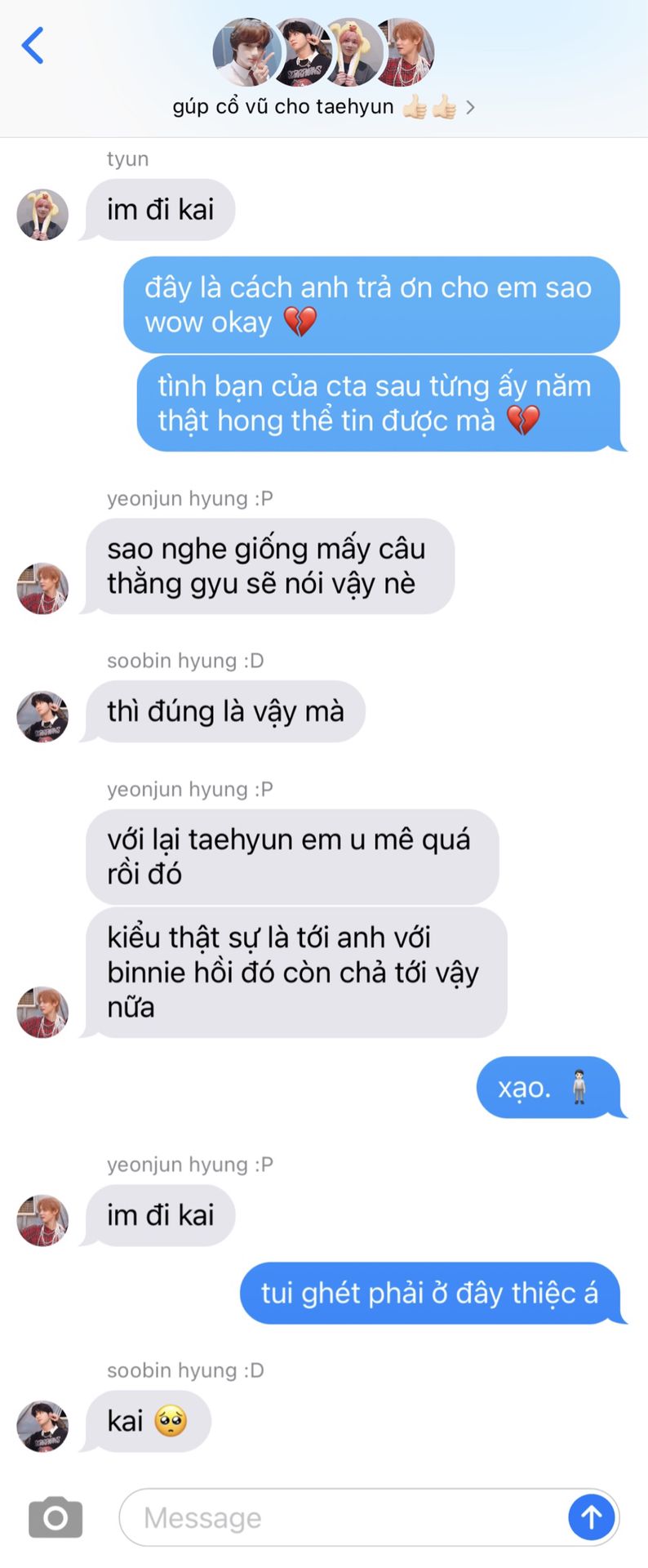 "đồ khùng này." beomgyu lẩm bẩm. taehyun khẽ cười với tương tác của hai người kia.