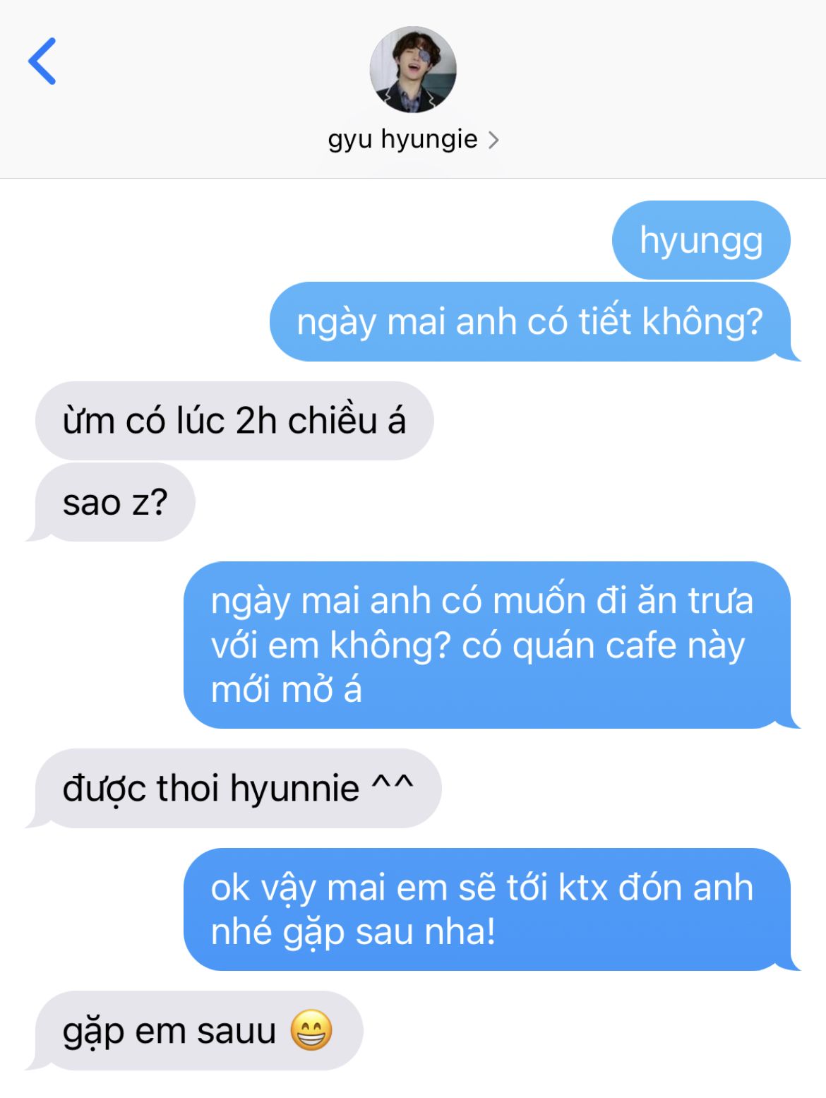 "chào hyung." cậu cười tươi rói.