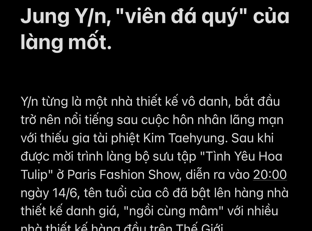 Show diễn Paris kết thúc mỹ mãn thành công. Y/n vừa bước chân ra khỏi cánh gà, phóng viên liền lao tới phỏng vấn cô tới tấp, quá nhiều câu hỏi dồn dập, Y/n bối rối, chỉ biết mỉm cười, đứng im như trời trồng, may sao có tên Kim thối kia nhanh tay kéo cô ra ngoài, không thì chết chìm trong biển người đó rồi.
