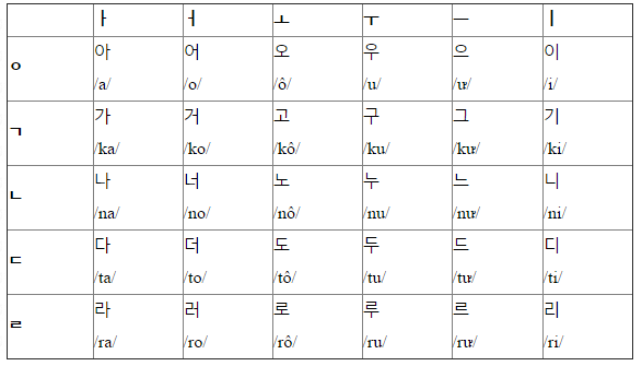 ㅏ, ㅑ, ㅓ, ㅕ, ㅗ, ㅛ, ㅜ, ㅠ, ㅡ, ㅣ