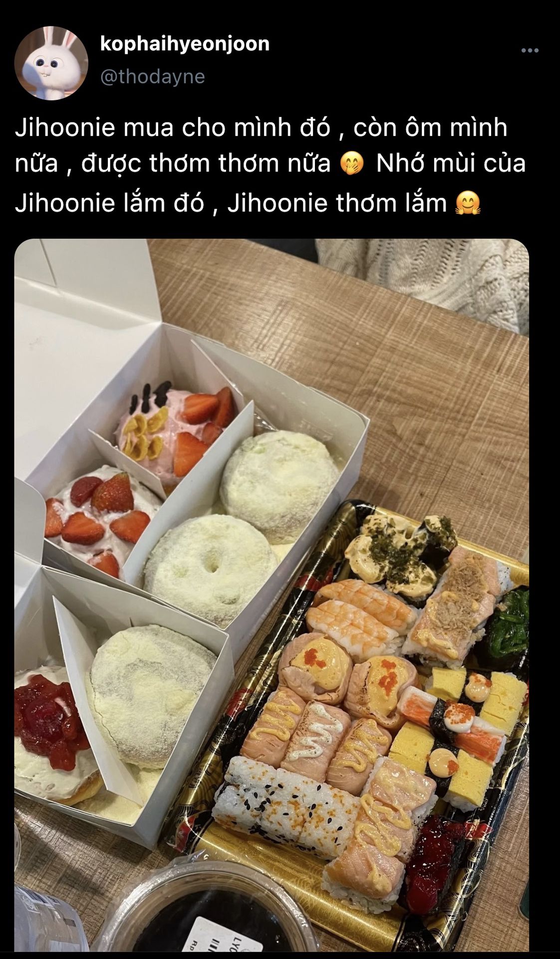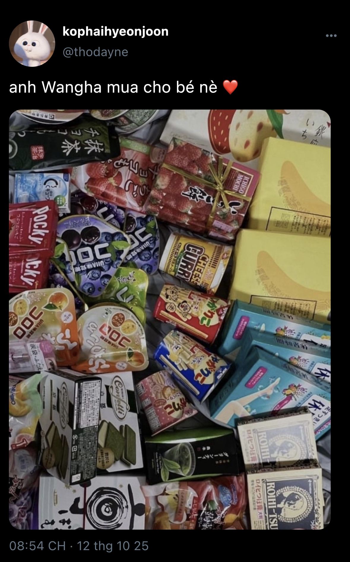 "Nay mọi người mua nhiều đồ ăn với thỏ bông cho anh "