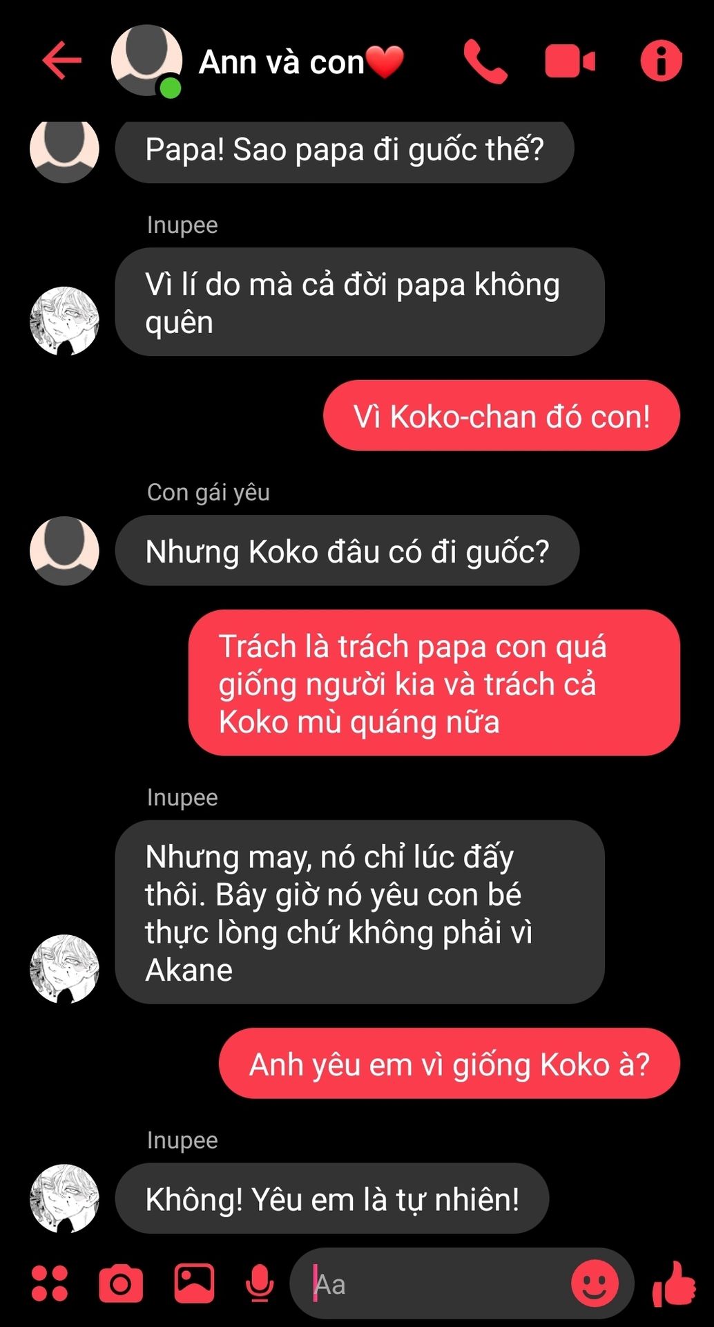 Với Rindou thì con gái là cục vàng cục bạc cục kim cương. Không đứa nào được bắt nạt con gái anh cả. Nhưng anh đâu biết được là con gái anh mang đôi mắt Violet đằng đằng sát khí doạ hết bao thằng ngoài kia rồi. Thế mà đối với anh thì cô con gái cưng vẫn còn quá bé nhỏ, trong mắt bạn cũng vậy.