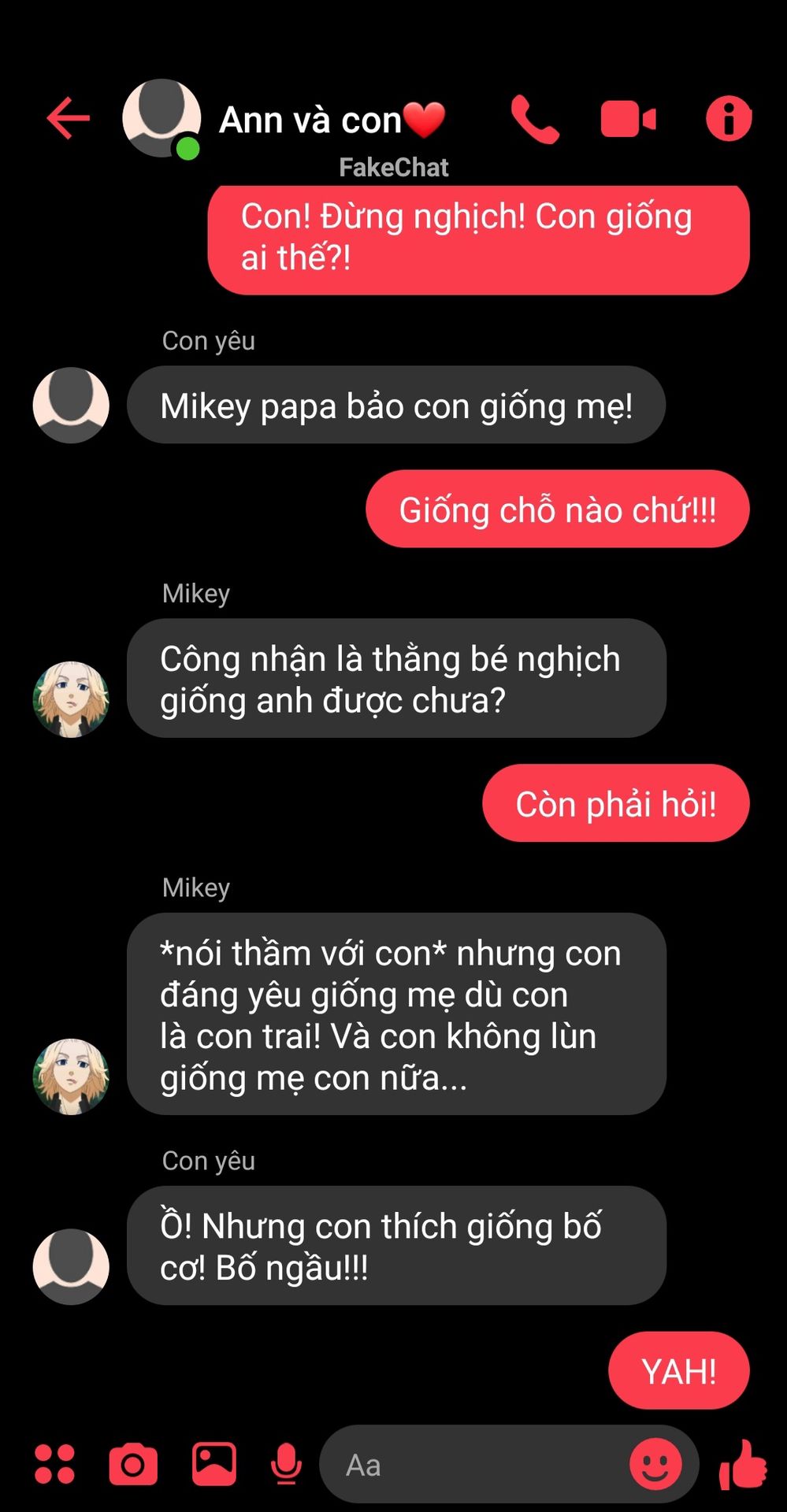 Con gái yêu của bạn rất 'hâm mộ' cậu bạn Mikey. Chẳng có lí do gì cả, khi Baji kể cho nó nghe Mikey đã tự hắc hoá bản thân để bảo vệ tất cả 'báu vật' còn lại của anh thì từ đó con gái yêu của bạn bắt đầu thích làm người giống Mikey. Do đó, con trai Mikey, con trai Draken hay con trai Chifuyu và rất nhiều người khác đều bị con bé quản lí, không cho trốn học đi chơi.