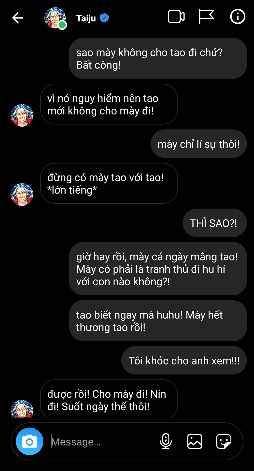 Khi anh và ban đang cãi nhau về việc gì đó thì bạn bảo anh là sẽ khóc cho anh coi và tất nhiên rồi, anh sẽ chẳng để bạn khóc đâu.