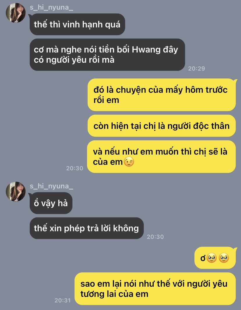 " ẻm hơi phũ nhưng mà ẻm xinh nên không sao hết " Hwang trải lòng