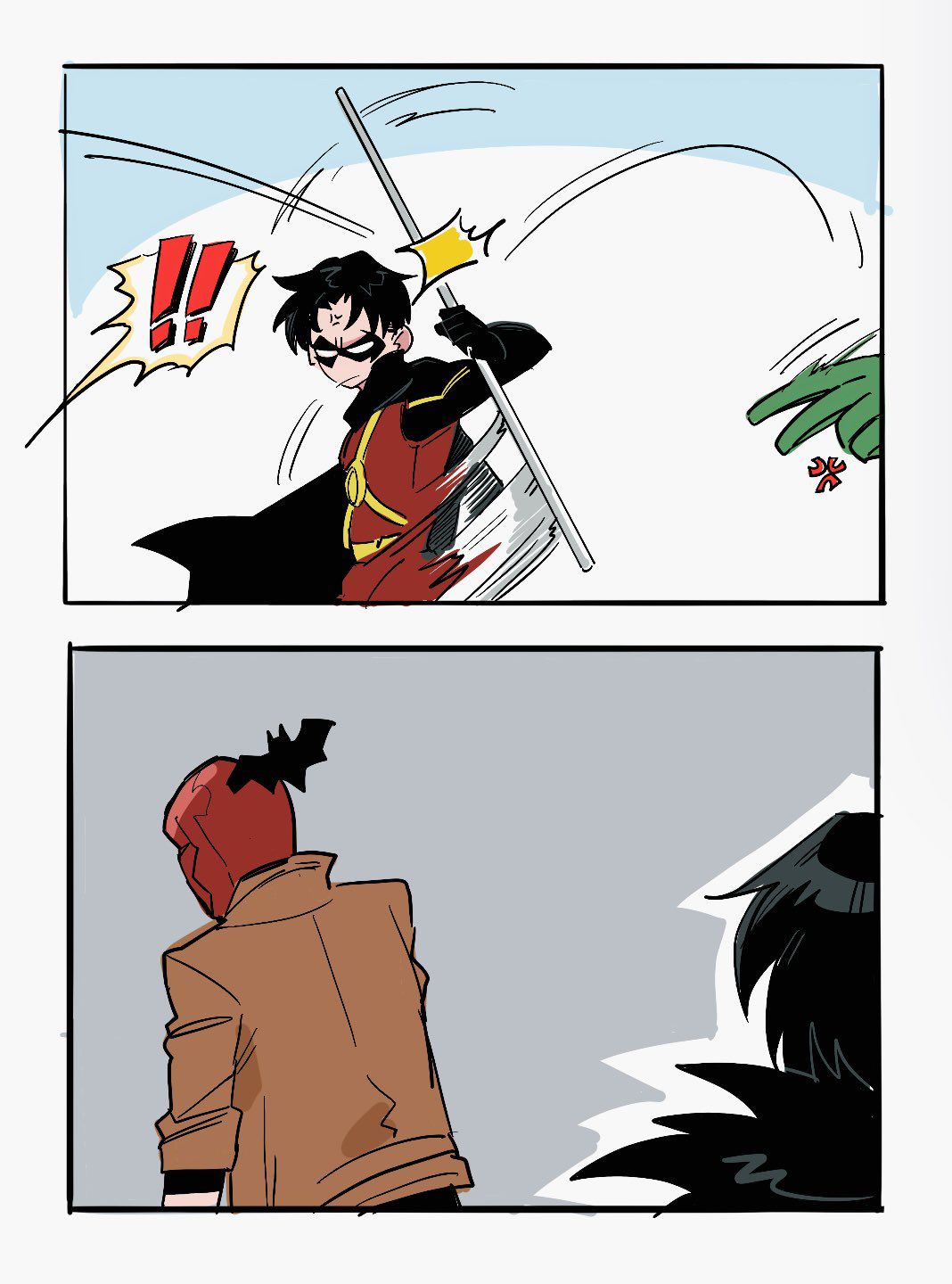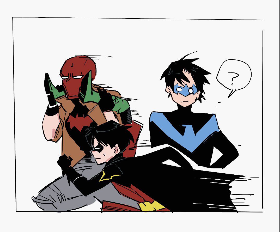 Trong khi Dick ngơ ngác thì Jason và Tim đã vội "tốc biến" để tránh rắc rối, giận nhưng Jason cũng không quên vác theo Damian chuồn cùng (không biết là thương em hay sợ thằng nhỏ kể với Bruce ai là người ném nó đi như cái batarang nữa).