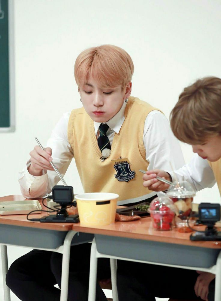 Jeon Jungkook, 10C, học vượt lớp một năm. Từ để hình dung chính xác nhất là "tsudere", cơ mà có đồ ăn là nó khác ngay. Hay tình cờ nhặt được cái gì đó trên đường rồi quăng cho Seokjin. Liệt kê một số như sữa chuối, dây tây, tivi, đồ hiệu, vân vân và vân vân.